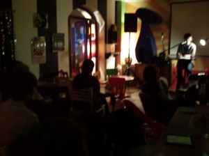 Gemütlichbuntdurcheinander war es dann im Café Stilbruch, und auch sehr schön. Das Herz klopfte nur zwei Minuten vorher so arg, als müsste es einem Defizit entgegenarbeiten. Auf der Bühne dann wie eh und je: Gut nämlich. Mikrophonküsse und dergleichen.