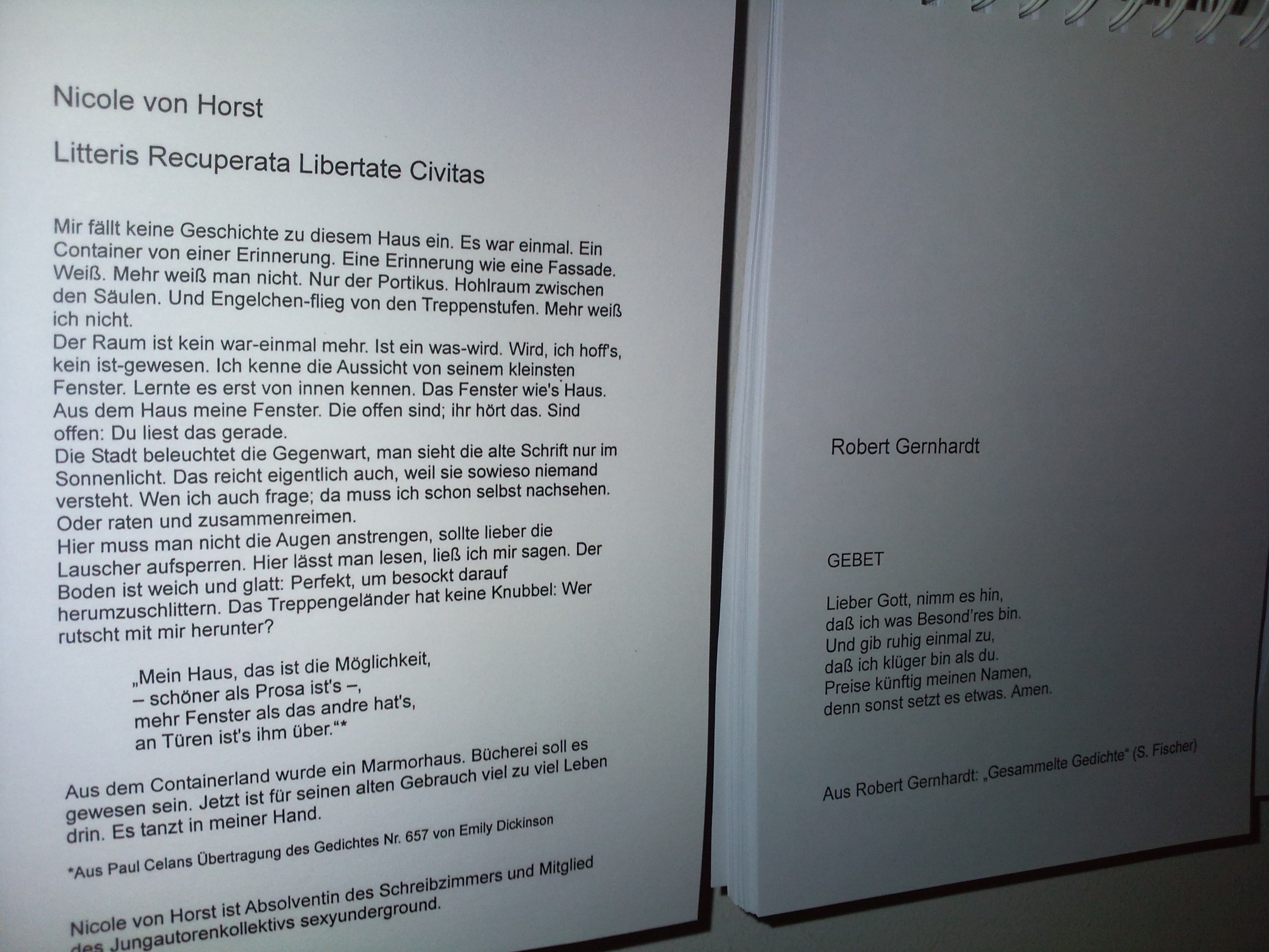 Kann das Fenster im Schlachtraum nicht transparent sein? Sodass man Sommerblätterrascheln auch sehen könnte und Sonnenfleckenspiegeln. Milchglas öffnet keinen Hoffnungsraum. Es ist sogar klebverknittert. (Ein Spaltbreit. Es ist immer einen Spalt breit. Da passt nur ein Arm durch, höchstens. Wenn man denn so hoch käme.)