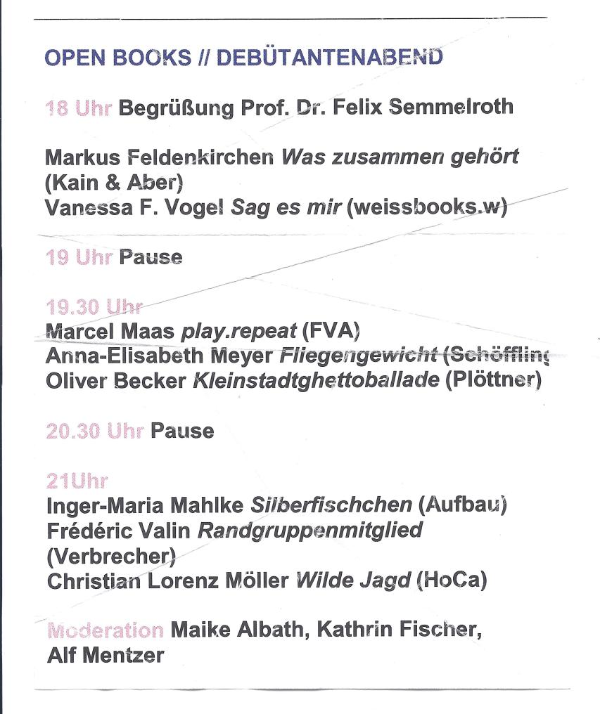 Markus Feldenkirchen erkenne ich aus dem Frühstücksfernsehen wieder. Da wunderte ich mich, dass er nicht Teil des Debütantenabends sei, das ist doch auch ein Debüt, ein richtiger Roman. Wie es gekommen sei, dass er ins Cornflakesmilieu gerutscht sei, da, wo die Uhrzeit in einer Sonne angezeigt wird, statt auf einem Literaturkarusselpferd sitzen zu dürfen. Ich muss aufmerksamer lesen. Tut er auch. Also, seinen Text aufmerksam lesen. Verstellt seine Stimme für die wörtliche Rede der Mutter des Protagonisten so, dass man sich ihn gerne als Vorleser von Schnüpperle und Räuber Hotzenplotz denkt. „Eierbär.“ Und warum sitzt eigentich Sabrina Janesch bei dieser Veranstaltung auf keinem Pferd?