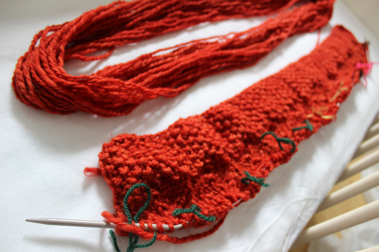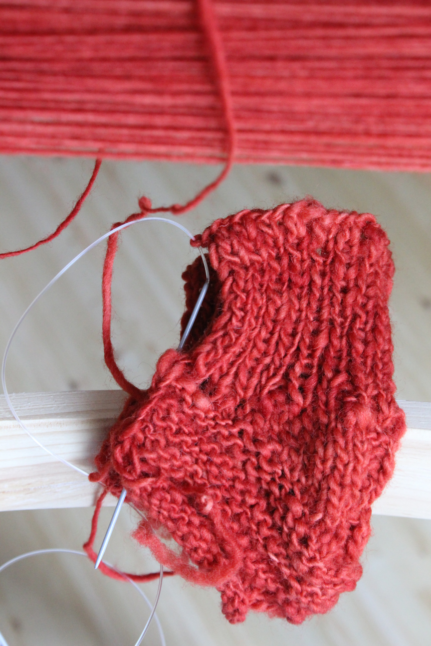 700g Wolle gesponnen, mehrmals mit Krapp gefärbt, miteinander zu 504cm verzwirnt. Daraus soll eine Babydecke werden. Weil ich mich nicht für ein Muster entscheiden kann habe ich ein eckiges und ein rundes angestrickt. Das eine ist interessanter, das andere strickt sich angenehmer. Für beide reicht das Garn nicht. Wir werden sehen. Noch fast vier Wochen.
