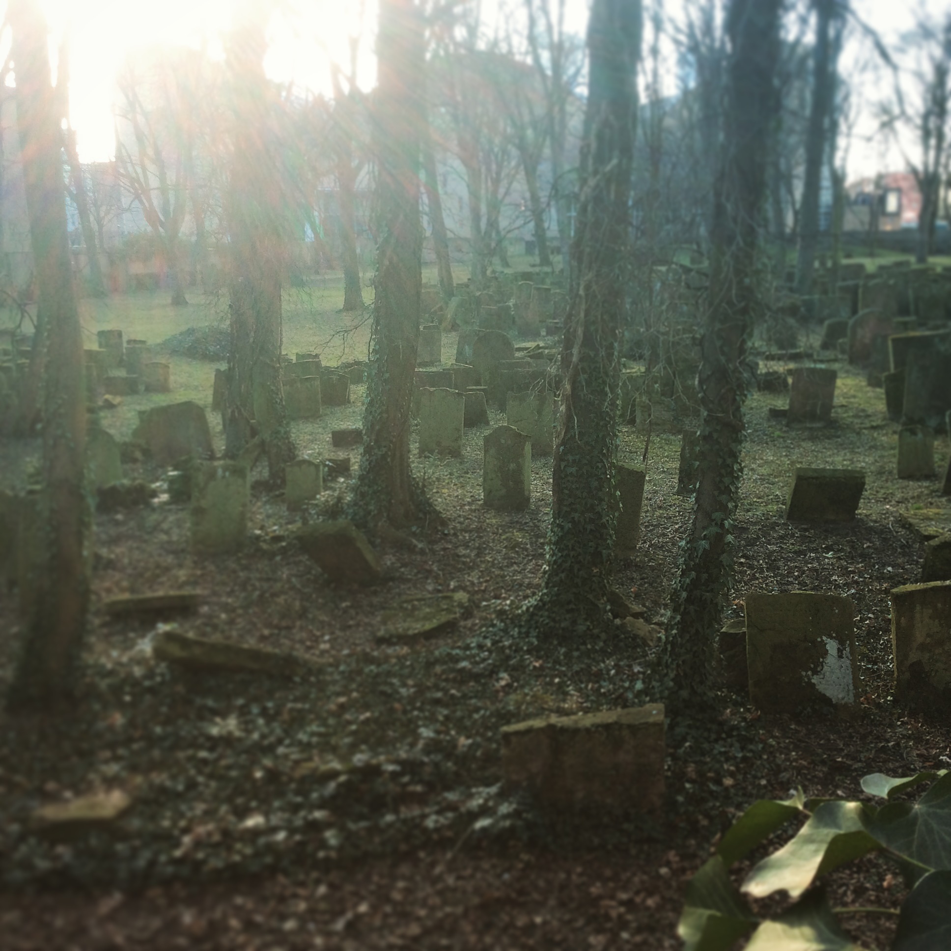 Spätnachmittags das Kind von der Krippe abholen. Von der aus man die beste Sicht auf den alten jüdischen Friedhof hat und dafür die Nase nicht zwischen ein Türgitter klemmen muss.