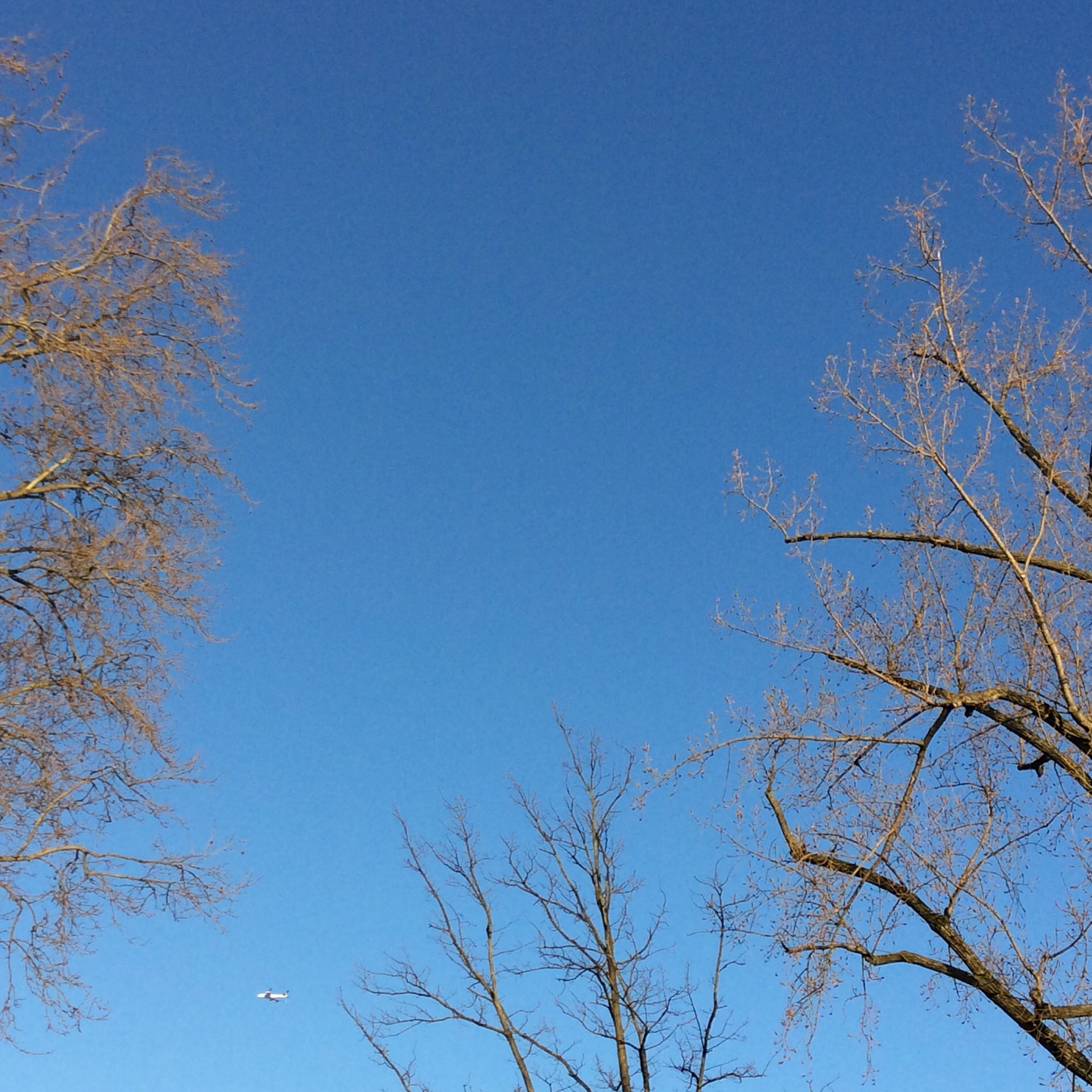Nach einem Flugzeug Ausschau gehalten, um es zu fotografieren, weil sich ein Wunsch darin verbirgt. In einer Stadt leben, in der es so konstant nach Flugzeug dröhnt, dass ich es nicht als Störgeräusch wahrnehme, aber wenn ich mal absichtlich eins sehen will, ganz schön lange warten und ins Blau starren muss.