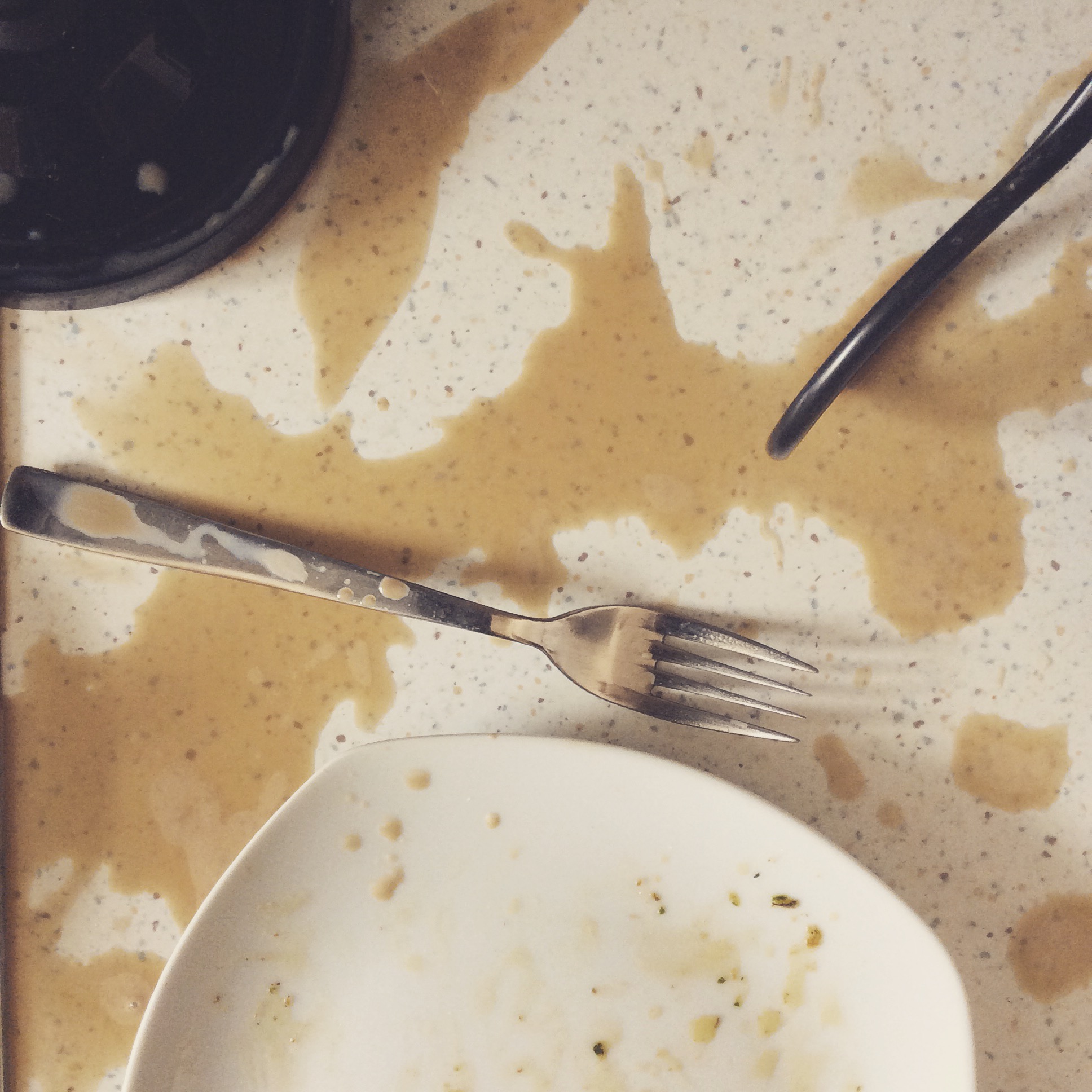 Beim Versuch aufzuräumen von Schlafmangel und Kaffeeüberfluss zittrig letzteren verschütten. Aber nicht auf die frisch angezogene Kleidung, zum Glück.