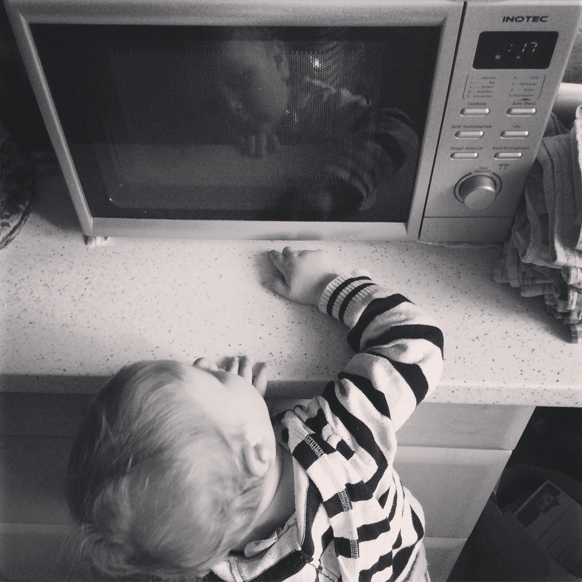 Abendessen. Nudeln, die von meinem Mittagessen übrig blieben, mit selbstgemachter Soße aus der Plastikdose. Beides erst kalt, dann „heiß! heiß!“ . Das einzige Wort, das das Kind flüstert. Wir pusten.
