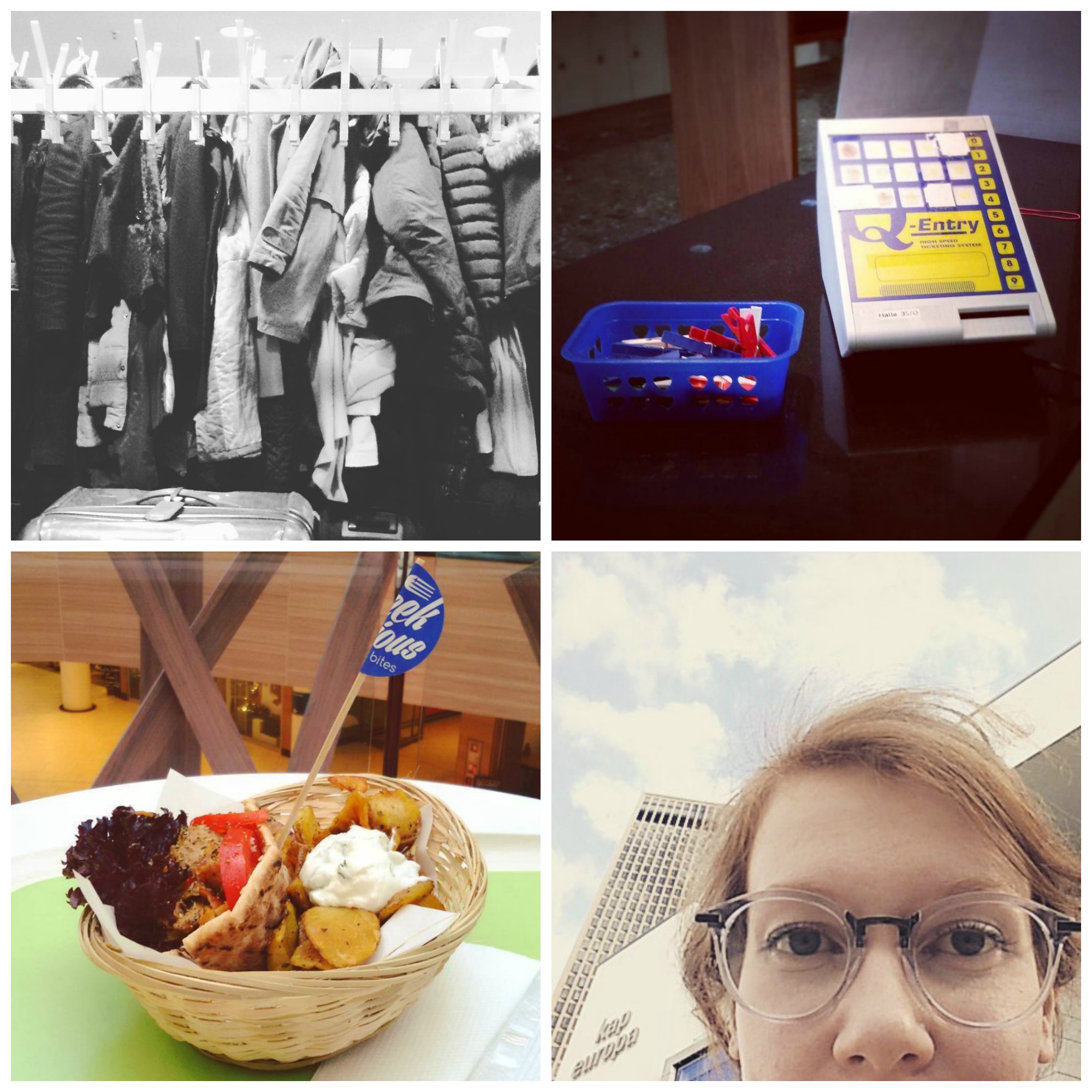 Über den Tag verteilt irgendwas zwischen 700-1000 Kleidungstücke und etwas weniger Koffer und Taschen hin- und herschleppen. Je mehr Arbeit es auf einem Haufen ist, umso schneller vergeht die Zeit, aber ab mittags zieht sie sich wie Karamell. Ich mache Pause in einem Food Court. Mit Smartphone im Lärm sitzen, schlingen und scrollen, das ist nicht erholsam, aber ich arbeite danach an einer ruhigeren Stelle weiter. Fancy-schmancy: wir sind doppelt so viele Arbeiter_innen als in der Garderobe vorher, mit halb so vielen Garderobenstücken.
