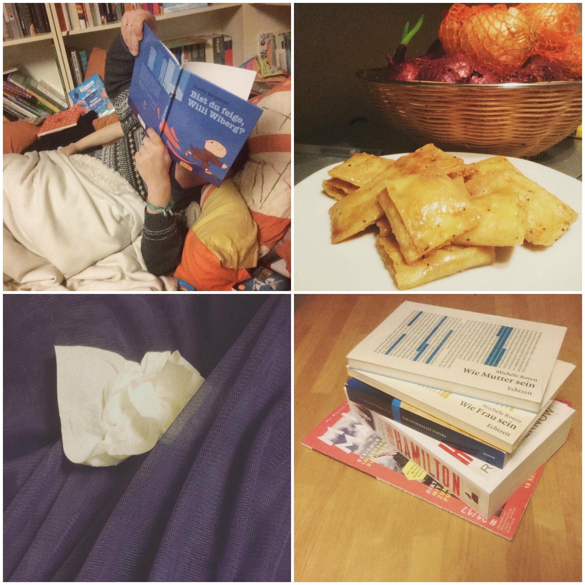 H. liest T. noch etwas vor, dann gehen beide schlafen. Ich brate mir Maultaschen in Kürbiskernöl mit einer weiteren Spezialzutat, die ich jetzt vergessen habe. Bevor ich mich wieder in den Schlaf huste, bewundere ich noch den Turm aus Printmedien, den ich heute im Briefkasten hatte. Alles geschenkt und alles auch gewünscht. (Merci.)